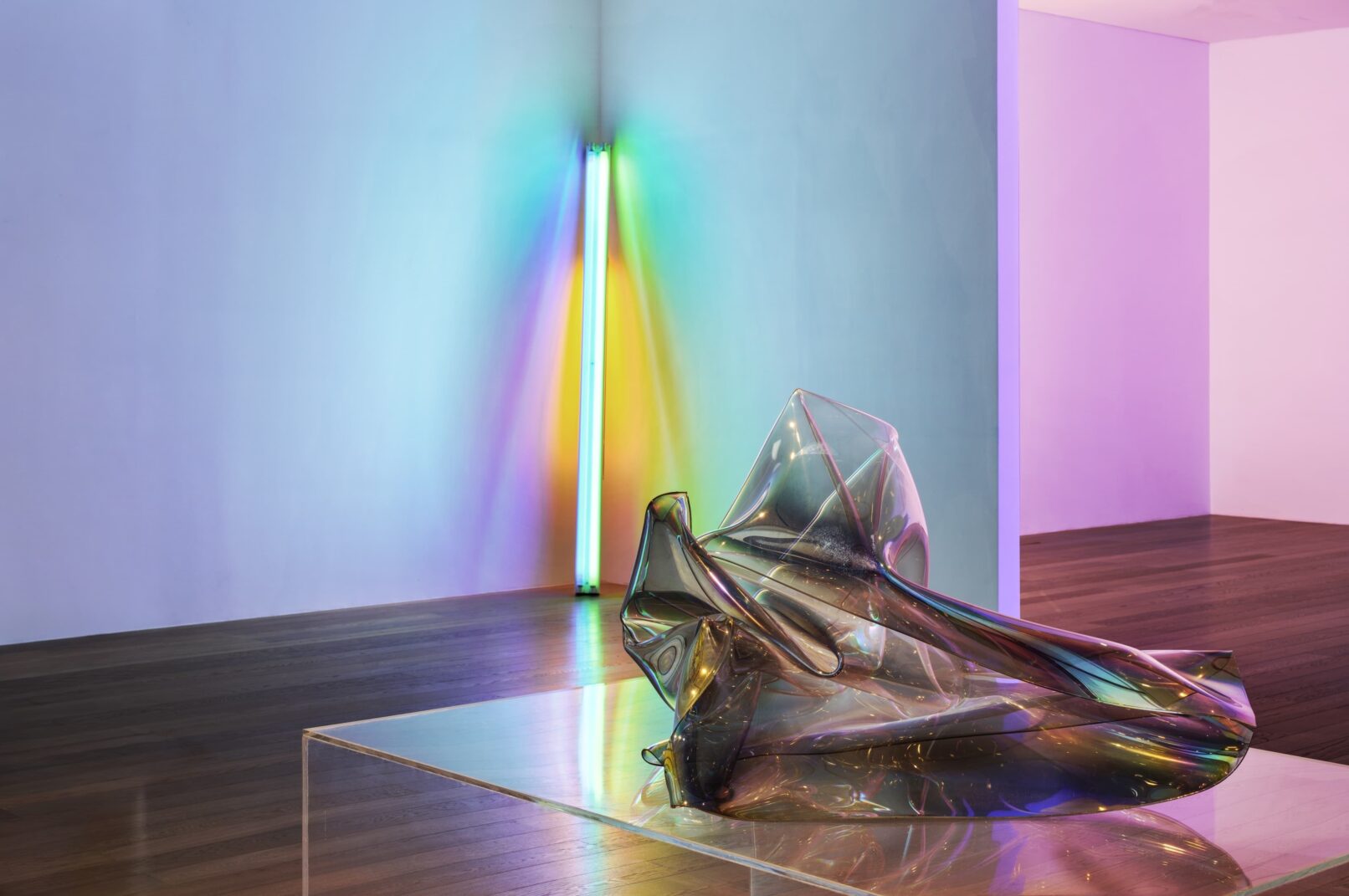 Light Into Space, a landmark exhibition, was made in collaboration with the Dia Art Foundation, New York, marking their debut in India. Housed at the Nita Mukesh Ambani Cultural Centre, this exhibition brings together the works of artists John Chamberlin, Mary Corse, Dan Flavin, Nancy Holt, Robert Irwin, Francois Morellet, Robert Smithson, and Walter De Maria, pioneering artists of the 60s and 70s New York postmodern scene.